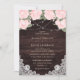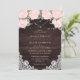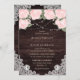 Complement your blush pink rustic wedding party with this elegant blush floral wedding invitation featuring blush pink roses and baby's breath on a barn wood background decorated with white floral lace and string lights. Matching items available.