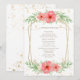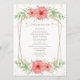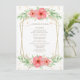 Elegant Beachy Bohemian Wedding Menu Featuring A Pretty Pink & Ivory Watercolor Greenery Floral, Geometric Gold Frame & Splatter Of Gold Specks.