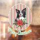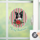 Fun custom cut window cling for home or business features watercolor Border Collie dog portrait with poinsettia bouquet and circular Christmas striped background. Customisable text in green font.