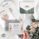 With their mix of floral bouquets and decorative fonts, this combined wedding invitation and RSVP postcard has just the right amount of romance. They’re inspired by an elegant garden wedding with soft pastel blooms in colours from blush pink through pale coral, muted greenery and classic design layouts. Search ID654 to see all the pieces in this matching wedding set.