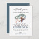 Elegant, religious boy First Holy Communion thank you postcard. Design features watercolor cross, Holy Bible and Rosary beads icon in blue colour, typography script ''first holy communion'' and ''thank you'' in modern lettering on a white background. Personalise with a name.