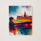 Watercolor Budapest puzzle with Hungarian Parliament building and Chain Bridge over Danube River colourful vintage style.