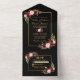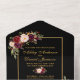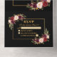 Elegant Burgundy Watercolor Floral Gold Frame All In One Wedding Invitation with RSVP Card includes burgundy roses, pink roses, red roses and botanical greenery. Black background.