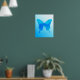 Print with a single, large, watercolor butterfly in soft shades of cobalt, turquoise and sky blue on a pastel gradient background