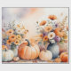 A beautiful autumn scene featuring vibrant pumpkins, surrounded by a collection of whimsical flower arrangements in vases. The background is softly blurred with pastel hues, creating a serene and inviting atmosphere, perfect for celebrating fall. Designed by artist Danguole Serstinskaja