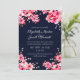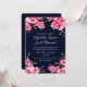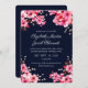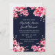 Virtual wedding invitation design features watercolor pink cherry blossoms on a dark blue background.