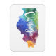 This design features a map of the US State of Illinois featuring the city of Chicago with a multicoloured hand painted watercolor texture. "Chicago" stylised text is added overtop with a star to indicate the location of the city.