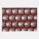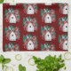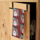 Festive kitchen towel has a watercolor pattern of birdhouses with holly leaves and berries on cranberry red background.