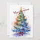 A festive watercolor Christmas tree adorned with vibrant ornaments and topped with a glowing golden star. Splashes of color and a bold red bow at the base add artistic charm to this joyful holiday scene. The reverse side features a heartfelt seasonal message and the sender’s name, printed for a personal touch.
