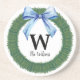 This coaster features a traditional watercolor Christmas wreath with a light blue bow. Personalise with your monogram and family name.