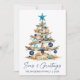 Modern Minimalist Elegance Calligraphy Ink Pen Handwritten Script Seas & Greetings Coastal Holiday Card includes a Watercolor Christmas Tree make of beach ocean driftwood, seashells, sand dollars, nautical anchor ornament and topped with a starfish. Navy Blue Text.