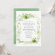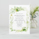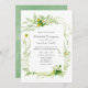Green and white wedding invitation featuring ferns, wildflowers and strawberries and a sage green watercolor wash background.