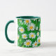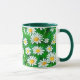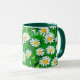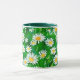 Coffee mug in a watercolor pattern of white daisies with golden yellow centres, on a grassy green background