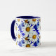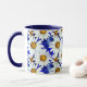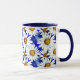 Mug in a watercolor pattern of white daisies with golden yellow centres, on a background in shades of denim blue