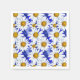 Paper napkins in a watercolor pattern of white daisies with golden yellow centres, on a background in shades of denim blue