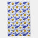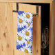 Tea towel in a watercolor pattern of white daisies with golden yellow centres, on a background in shades of denim blue
