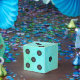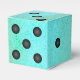 Blue watercolor background with dice dots creates a dice party favour box.
