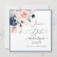 PixDezines watercolor flowers in dusty slate blue, blush roses and beautiful shade of blue gum foliage. Save the Date with modern calligraphy script.