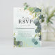 Elegant green wedding response cards featuring a faded watercolor washed out backdrop, botanical eucalyptus leaves, splashes of faux gold foil, and a simple wedding rsvp template.