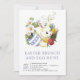 Modern watercolor Easter brunch and egg hunt invitation featuring Easter Bunny in a watercolor spring floral arrangement ,a chicken and eggs.
