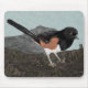 Mouse pad with my original mixed media image of an Eastern Towhee scratching on the ground among fallen fir needles and twigs. The watercolor bird is mostly black with a white breast and rust-coloured sides. Behind it is a large stone against a pale green grassy background.