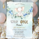 This first birthday invitation with cute watercolor blue elephant and blue roses and leaves.