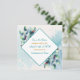 Beautiful simplistic wedding Save the Date cards with a watercolor Eucalyptus greenery botanical theme. Pretty pale sage green, blue, gold and white.