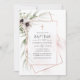 Baptism invitation featuring anemone flowers and eucalyptus leaves in a rose gold geometric frame.