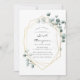 Trendy watercolor eucalyptus silver dollar bridal shower invitation with gold geometric frame.
