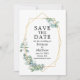 Modern Elegant Watercolor Eucalyptus Greenery Engagement Wedding Announcement Save The Date Card includes eucalyptus leaves on a gold geometric frame.