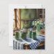 Sunlight streams through large kitchen windows, illuminating jars filled with green vegetables and a vase of daisies on a table draped with a blue and white chequered cloth. Wooden cabinetry and a green wall create a cosy, rustic atmosphere in the kitchen.