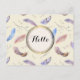 A pattern made up of watercolor feathers with varying stripes, spots and plain designs with colours in blue, pink, orange and brown colours. Branches and twigs with leaves and pussy willow buds also decorate the design. The background is a solid cream colour. A circle with a gold gradient border and a cream centre says "hello" but you can customise it to say whatever you like.