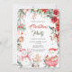 Celebrate Christmas in festive and whimsical style with our invitation featuring a watercolor Santa, snowman, gingerbread man, and winter floral elements. Include red roses, poinsettias, holly berries, pine branches, ornaments, candy canes, and gifts. on a white background.