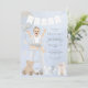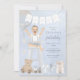 Blue and gold watercolor first birthday party invitation features an adorable boy baby in a highchair and adorned with a floral balloon, gifts, teddy bear, and toy train. Multiple options available for baby's hair colour and skin tone. Fun first birthday smash cake on back with number one. Can also be used for second birthday by changing text.