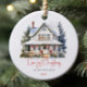 This beautiful ceramic ornament commemorates the "Our First Christmas in Our New Home" moment of your lifes. Featuring a charming illustration of a cosy snow-covered house adorned with festive holiday decorations, it is the perfect keepsake to celebrate a major milestone. Personalise your holiday decor with this elegant, timeless ornament, and cherish the memory of your first Christmas in your new space for years to come.
