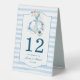 Wedding Table Number. Joyful and fun wedding design. Modern watercolor artwork featuring a beautiful blue anchor with anemone flowers and greenery. Light blue watercolor stripes. Light blue, light green, blush pink, white, teal blue. Teal blue lettering. Elegant font combo. Perfect for beach wedding, or nautical wedding.