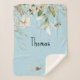 Mid-1600's Dutch watercolor still life floral art and personal name, decorate this warm and ultra-soft Sherpa fleece stroller blanket for a sweet baby boy. Change or remove name using the simple Template provided. This blanket is a small-- 30" wide by 40" long. Two larger sizes are available. See "About This Product" at side for more information and care. HIGH ratings. [background: Light Blue #B9DDE9]