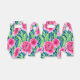 Floral watercolor painting of pink flowers and green leaves on a blue background. A fresh design and an ad-on to your floral collection.