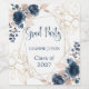 This design featuring illustration of watercolor navy blue and gold flowers with geometric golden frame and the text "Grad Party" written in a script style.