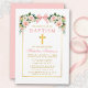Elegant Watercolor Pink White Floral Baptism Invitation includes pink roses, white flowers and greenery. Gold Cross. Pink Blush Bow Ribbon. Gold Frame.