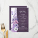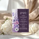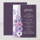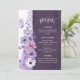 An elegant purple floral wedding menu card featuring soft watercolor flowers in lavender, blush, and white, accented with delicate botanical line art and a graceful butterfly. The tall vertical layout with a deep plum panel creates a romantic and sophisticated presentation, perfect for displaying starters, main course, and dessert in a coordinated floral wedding stationery suite. A beautiful choice for garden weddings, spring weddings, summer receptions, and elegant purple wedding themes.