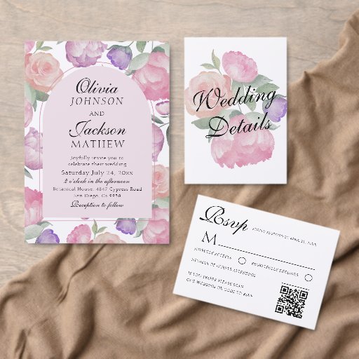 This elegant watercolor floral RSVP card features soft, romantic hand-painted blooms in blush pink, lavender, and sage green, creating a timeless and refined look for a summer or garden wedding. Designed to coordinate beautifully with a matching invitation suite, this response card includes a modern QR code option for easy online RSVPs, while still offering a traditional mailed reply layout. Fully customizable with your wording, names, and details, this design blends classic romance with contemporary convenience—perfect for couples seeking a stylish and cohesive wedding stationery collection.