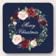 Merry Christmas. Elegant Blue Background with Watercolor Burgundy Marsala Floral Wreath Christmas Party Coaster. Includes beautiful roses and botanical greenery.