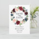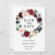 Elegant Watercolor Floral Wreath Save The Date Wedding Announcement Postcard includes burgundy roses, pink roses, blue flowers, red flowers, botanical greenery and eucalyptus leaves.