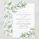 Invite family and friends to your wedding with this customisable greenery wedding invitation. It features watercolor illustrations of green foliage, white flowers, and a matching botanical pattern. This white floral wedding invitation is perfect for spring and winter weddings. Personalie by adding your details.