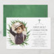 Trendy wild woodland forest greenery first communion invitation card designed to be quickly and easily customised to your specifics. A portrait shaped photo is recommended.