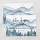 Elegant rustic watercolor mountains and forest scene wedding thank you card, featuring lush blue and green trees and mountains with a script text: let the adventure begin. For those who love a romantic dreamy woodland vibe for their ceremony and celebration.