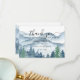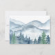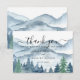 Elegant rustic watercolor mountains and forest scene wedding thank you card, featuring lush blue and green trees and mountains with a script text: let the adventure begin. For those who love a romantic dreamy woodland vibe for their ceremony and celebration.