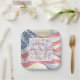 A watercolor painting of the American flag waving against a soft, ethereal background. The flag is rendered with loose, flowing brushstrokes showing the red and white stripes and blue field with white stars. The stripes are painted with varying widths and subtle color variations, creating a dynamic movement across the canvas. The stars are depicted in a loose, impressionistic style with soft edges. The background features gentle blue and yellow watercolor washes that blend together, creating a dreamy atmosphere. The flag is positioned diagonally across the composition, with the top left corner leading down towards the bottom right. The painting style emphasizes the movement and texture of the flag's fabric, with visible brush marks and paint bleeding typical of watercolor technique. The overall color palette consists of deep blue, bright red, pure white, and soft yellow tones, all rendered in a loose, expressive style.