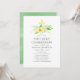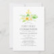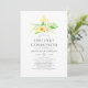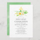 Sage green, yellow and white botanical tropical frangipanis first holy communion invitation cards designed to be quickly and easily customised to your event specifics.